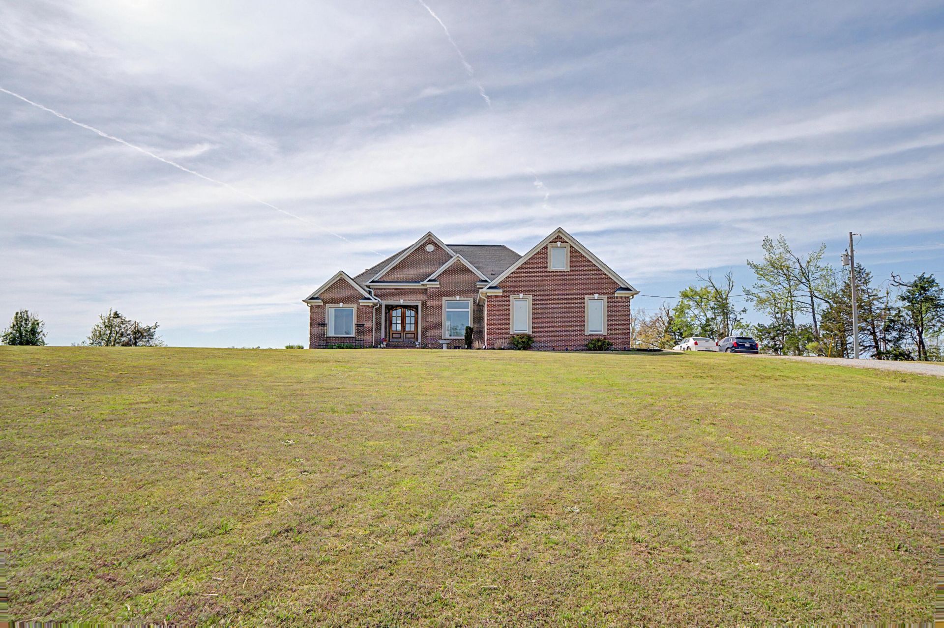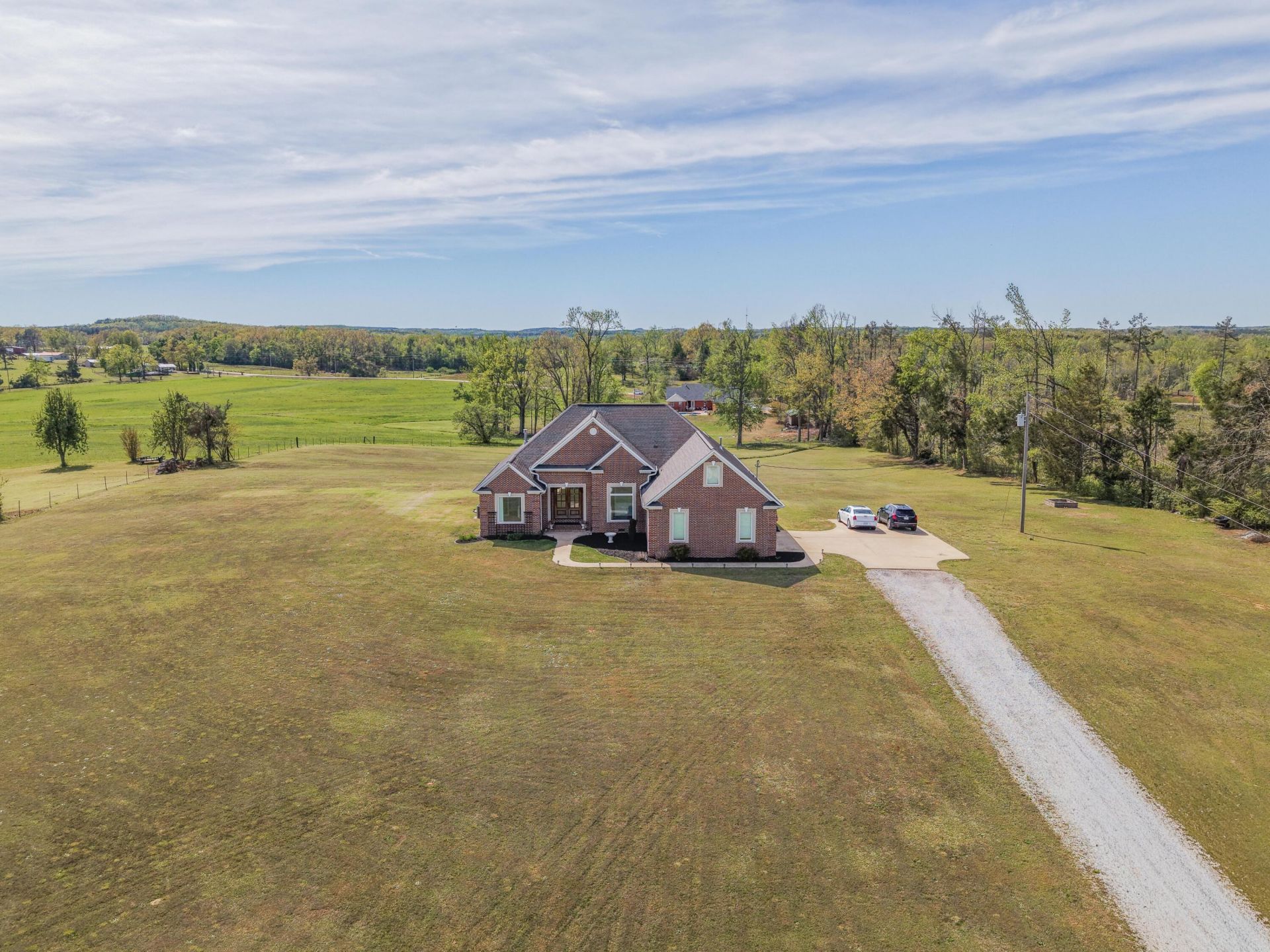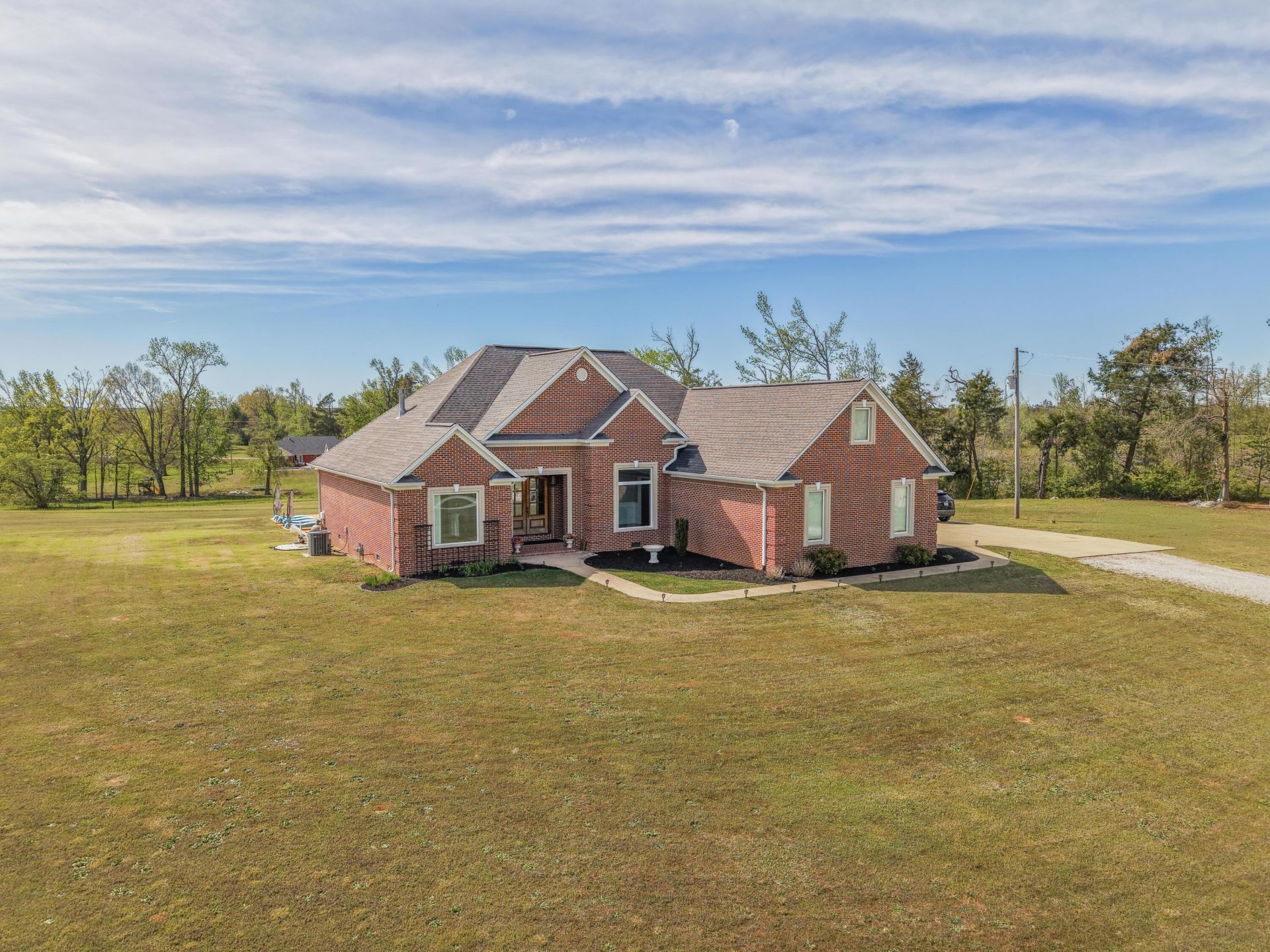 The setting of this property is Picturesque! This all brick, one-level open concept plan sits on a hilltop over look a large pond and hay fields and pasture! Enjoy morning sunrises over the pond and evening sunsets from the back porch or L-shaped in-ground pool! The interior has open kitchen/dining/family room with vaulted ceiling and gas logs! The kitchen is separated by a spacious granite bar top! The Primary Suite opens to back porch and has a spacious bath with separate vanities, walk-in glass front shower, and soaking tub! Large laundry room! Great views from the salt-water pool and the kids will love the circular waterslide! The amazing lawn gives space to enjoy with pets and family! This property also comes with a workshop offering 220 service and great storage on second floor.